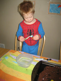 Asa making dog food for his letter D craft page. This is part of the All About Reading Pre-Level 1 that we LOVE so much.